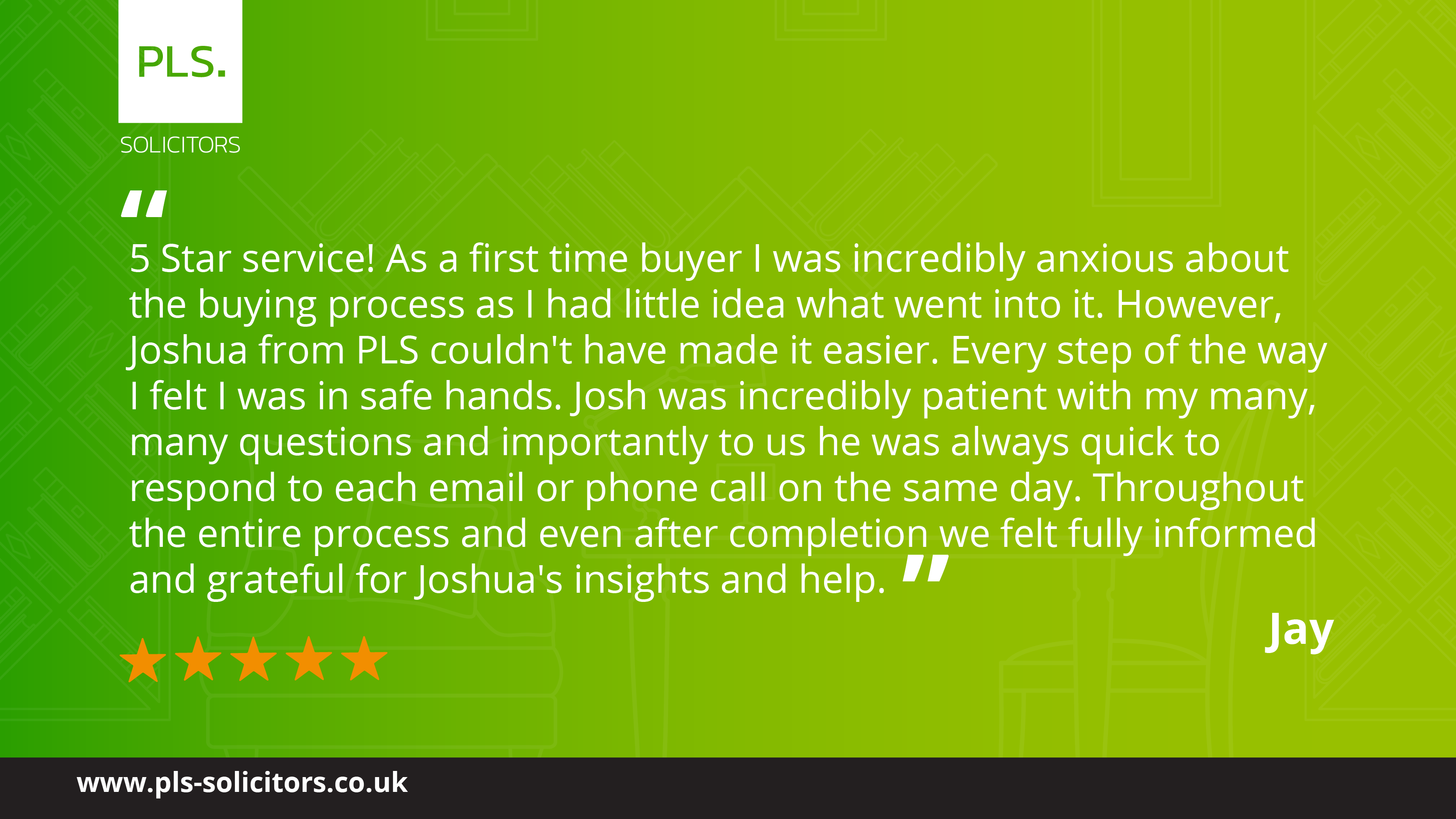 5 Star service! As a first time buyer I was incredibly anxious about the buying process as I had little idea what went into it. However, Joshua from PLS couldn’t have made it easier. Every step of the way I felt I was in safe hands. Josh was incredibly patient with my many, many questions and importantly to us he was always quick to respond to each email or phone call on the same day. Throughout the entire process and even after completion we felt fully informed and grateful for Joshua’s insights and help.