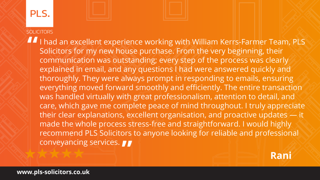 “PLS Solicitors have been amazing. While helping us with our first ever house move. The communication was amazing whenever we phone someone was always willing to help.”