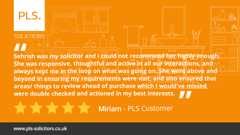 “I brought my home using PLS services. The entire process is naturally stressful, and our transaction was a little complex and unusual in nature. Sehrish was my solicitor and I could not recommend her highly enough. She was responsive, thoughtful and active in all our interactions, and always kept me in the loop on what was going on. She went above and beyond in ensuring my requirements were met, and also ensured that areas/ things to review ahead of purchase which I would’ve missed were double checked and actioned in my best interests. I am so happy she dealt with our purchase, and if I ever need to do home transaction, I hope I am able to secure her talent!“